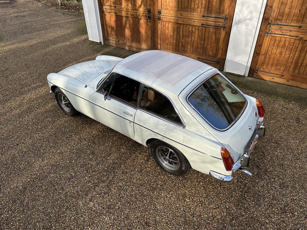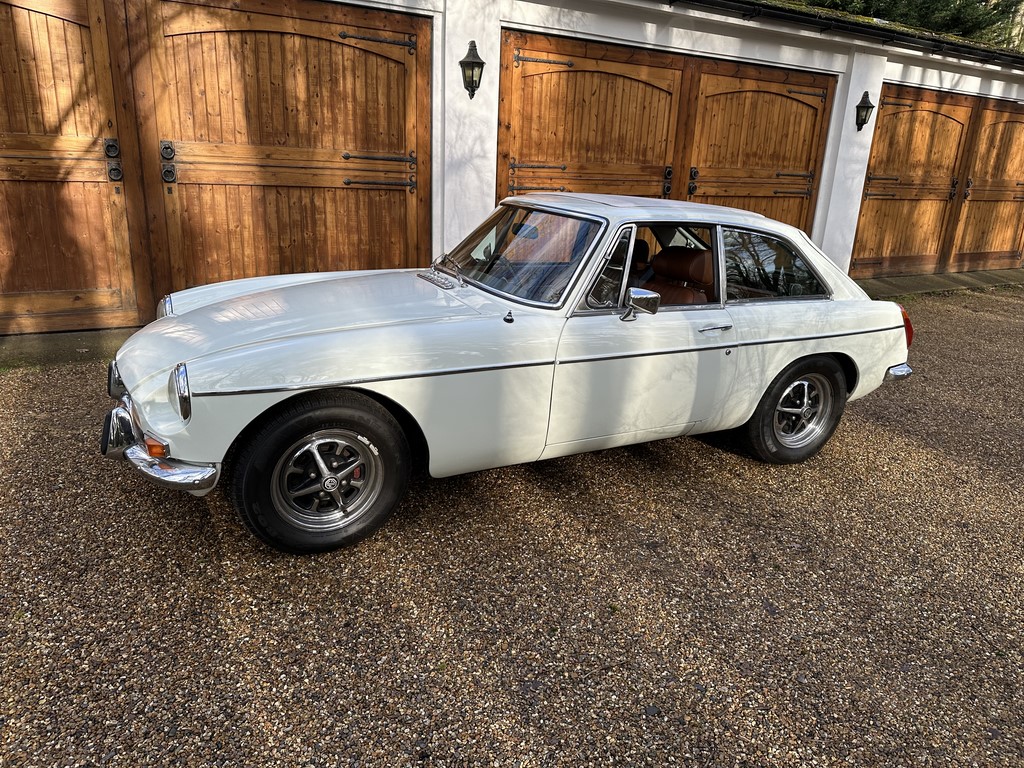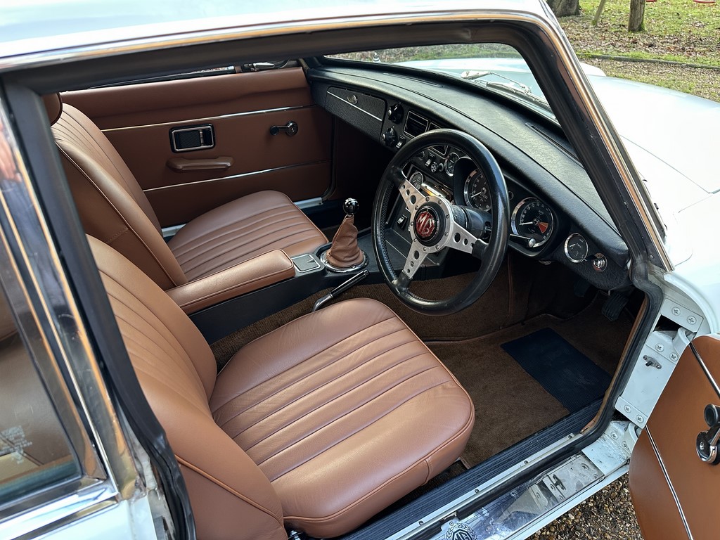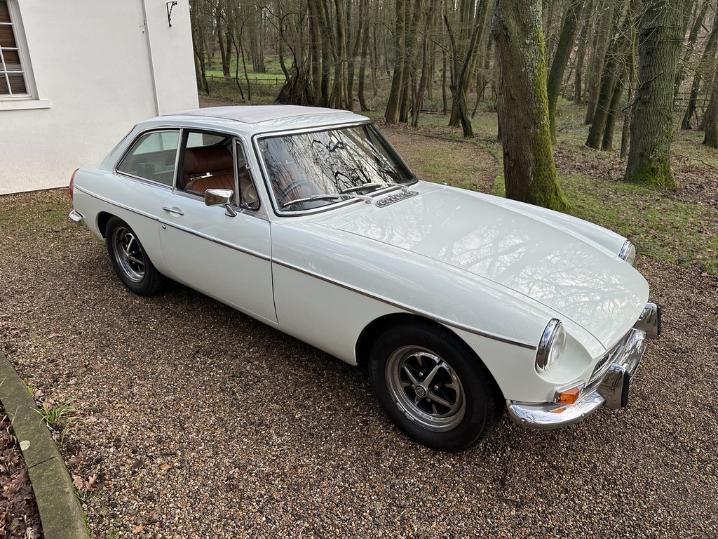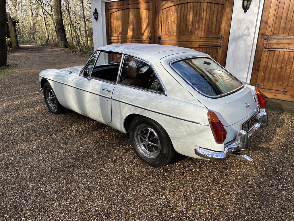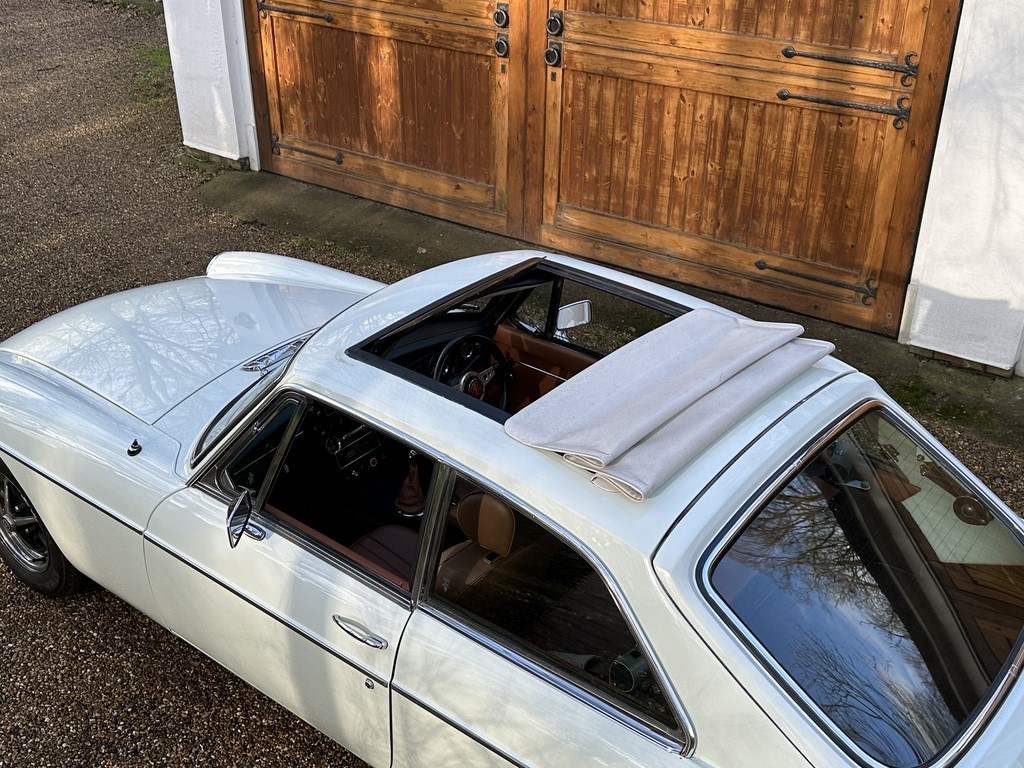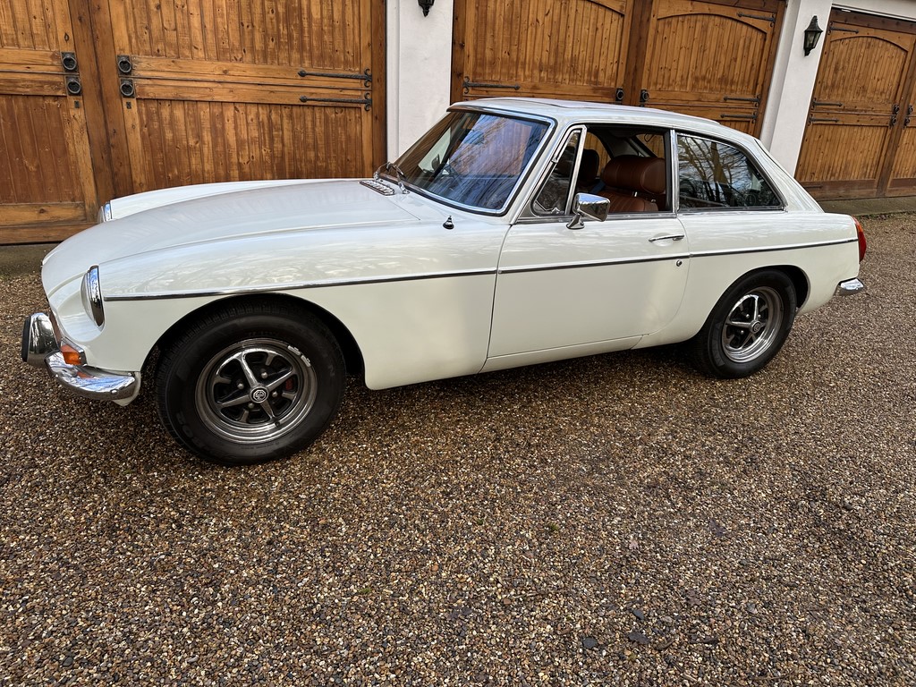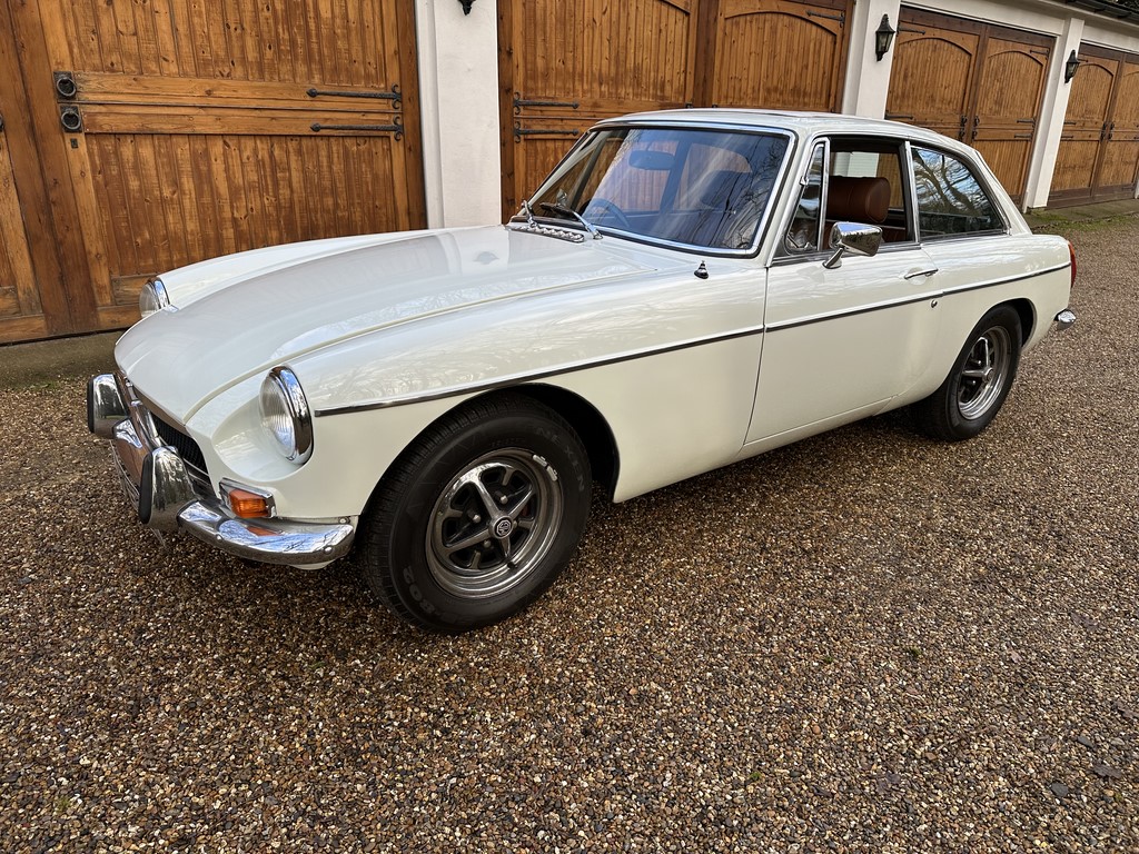 MG BGT Registered 1 August 1974, chrome bumper model, overdrive, older mid 90’s restoration by renowned, BL Heritage Approved Motorspeed Ltd and included sills, jacking points, floor pans, doors, tailgate etc. etc., bare metal prepared White coachwork still presenting well with some imperfections only commensurate with age since restoration and mileage, recent quality Autumn Leaf leather interior trim by ‘Mirror Trim’ specialists of Bedfordshire at a cost of £2.5k, Webasto sunroof, recently detailed engine compartment housing standard 1800 power unit with good oil pressure, nice original condition rare Chrome Rostyle wheels,  heavy history file with a plethora of documents covering the earlier restoration, spread sheets and invoices for more recent works that includes suspension, water pump, starter motor, fresh oils and filters, old mot’s etc.etc. drives delightfully, previously sold by us, just arrived,