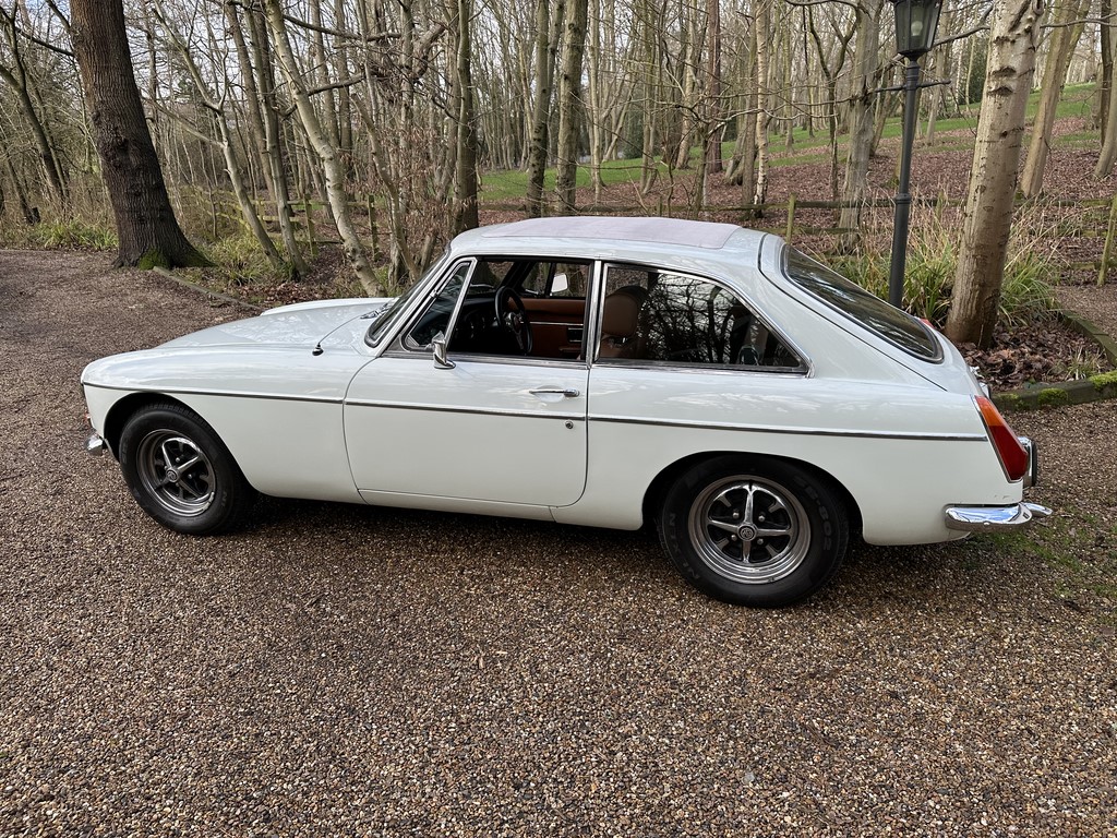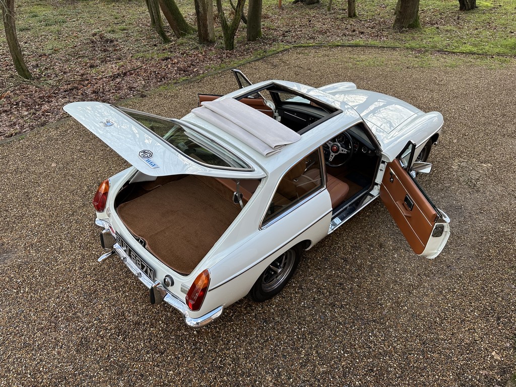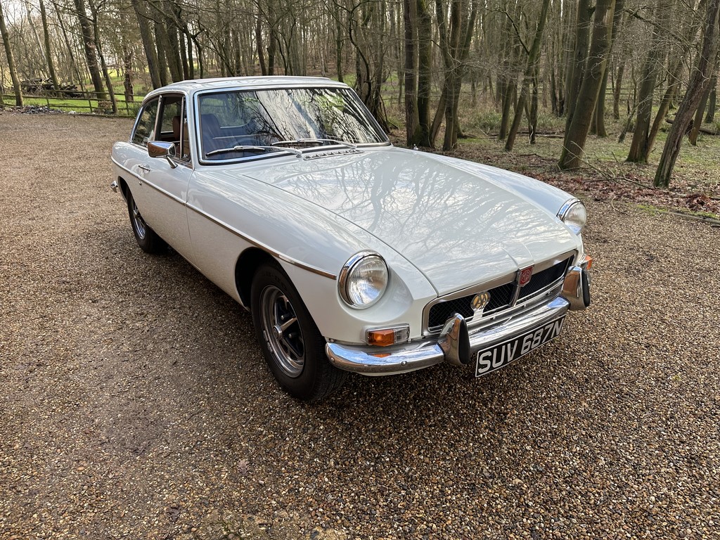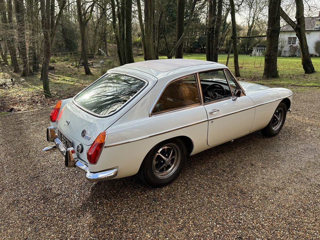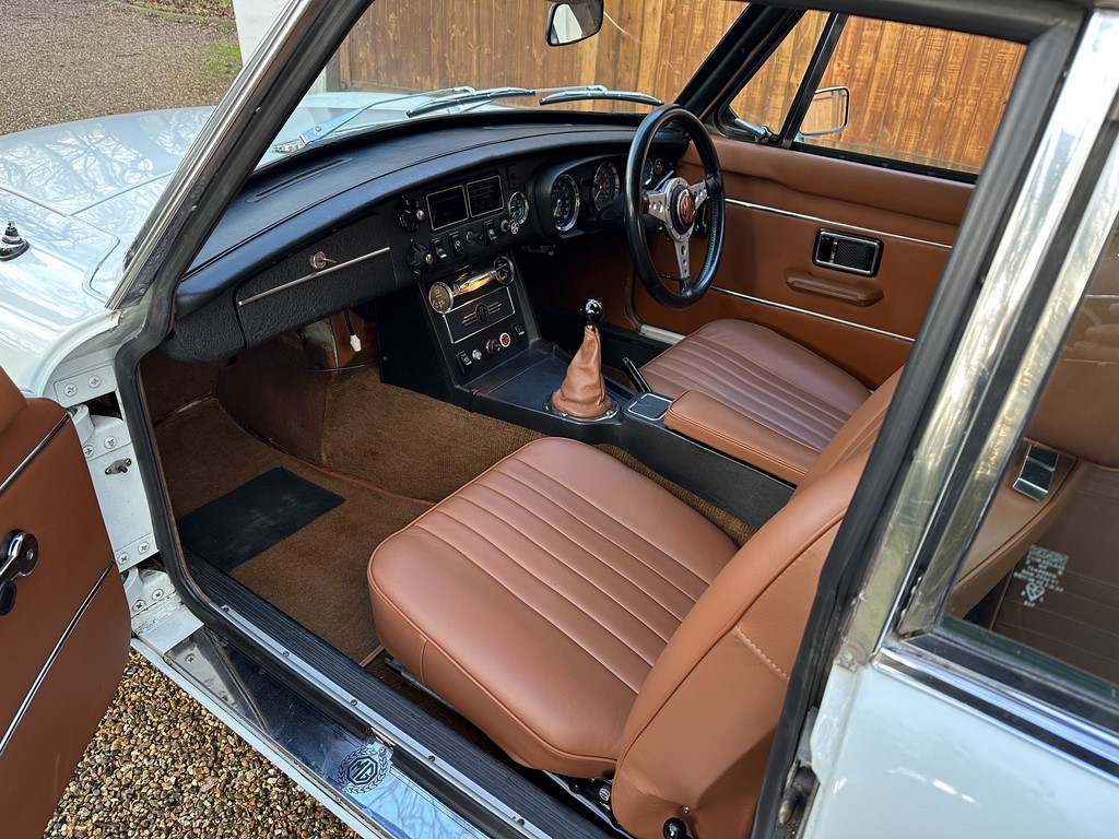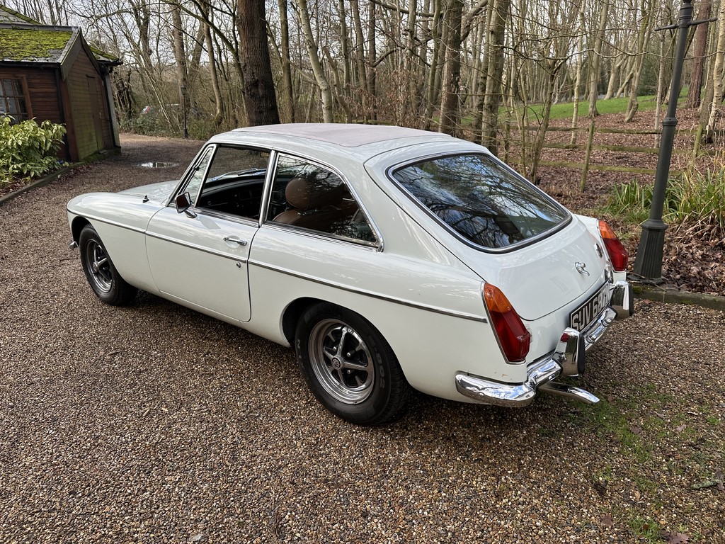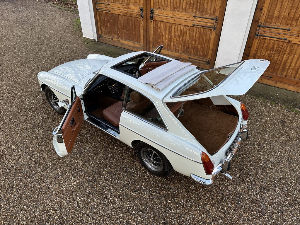 MG BGT Registered 1 August 1974, chrome bumper model, overdrive, older mid 90’s restoration by renowned, BL Heritage Approved Motorspeed Ltd and included sills, jacking points, floor pans, doors, tailgate etc. etc., bare metal prepared White coachwork still presenting well with some imperfections only commensurate with age since restoration and mileage, recent quality Autumn Leaf leather interior trim by ‘Mirror Trim’ specialists of Bedfordshire at a cost of £2.5k, Webasto sunroof, recently detailed engine compartment housing standard 1800 power unit with good oil pressure, nice original condition rare Chrome Rostyle wheels,  heavy history file with a plethora of documents covering the earlier restoration, spread sheets and invoices for more recent works that includes suspension, water pump, starter motor, fresh oils and filters, old mot’s etc.etc. drives delightfully, previously sold by us, just arrived,