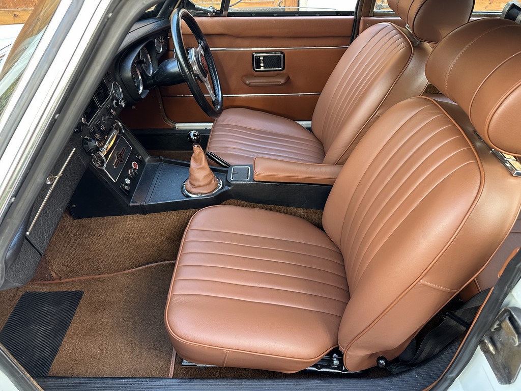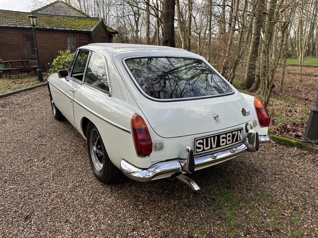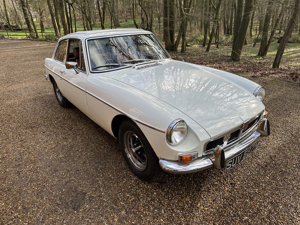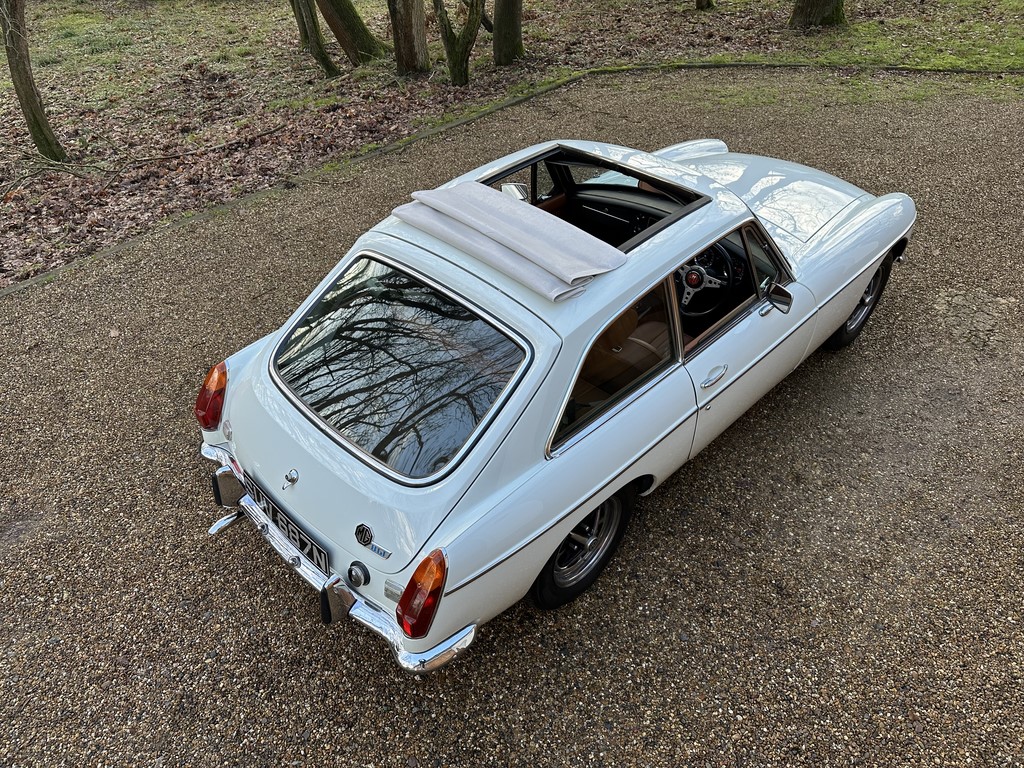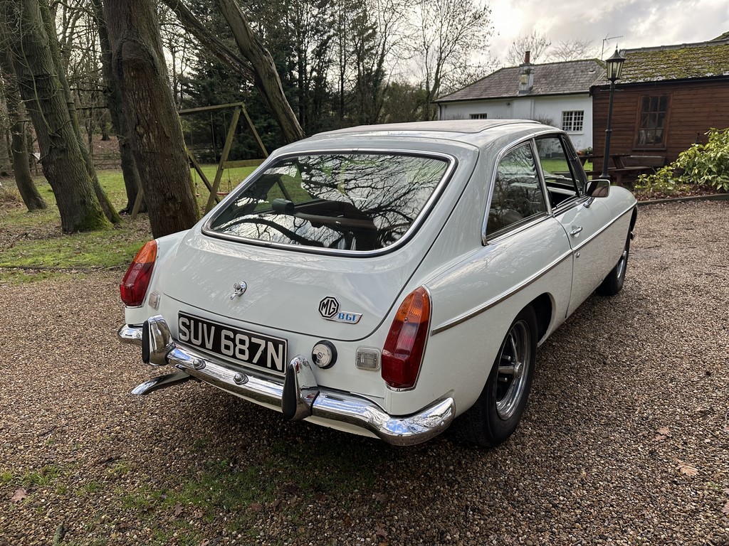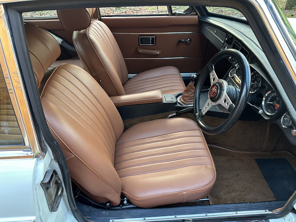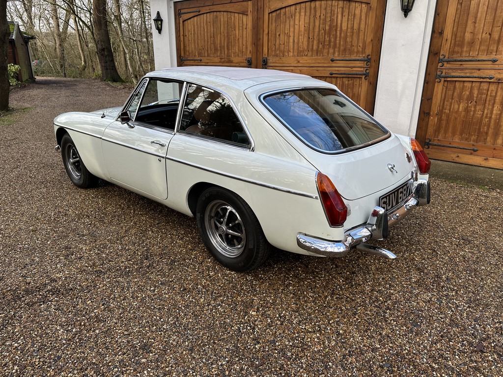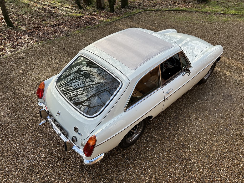 MG BGT Registered 1 August 1974, chrome bumper model, overdrive, older mid 90’s restoration by renowned, BL Heritage Approved Motorspeed Ltd and included sills, jacking points, floor pans, doors, tailgate etc. etc., bare metal prepared White coachwork still presenting well with some imperfections only commensurate with age since restoration and mileage, recent quality Autumn Leaf leather interior trim by ‘Mirror Trim’ specialists of Bedfordshire at a cost of £2.5k, Webasto sunroof, recently detailed engine compartment housing standard 1800 power unit with good oil pressure, nice original condition rare Chrome Rostyle wheels,  heavy history file with a plethora of documents covering the earlier restoration, spread sheets and invoices for more recent works that includes suspension, water pump, starter motor, fresh oils and filters, old mot’s etc.etc. drives delightfully, previously sold by us, just arrived,